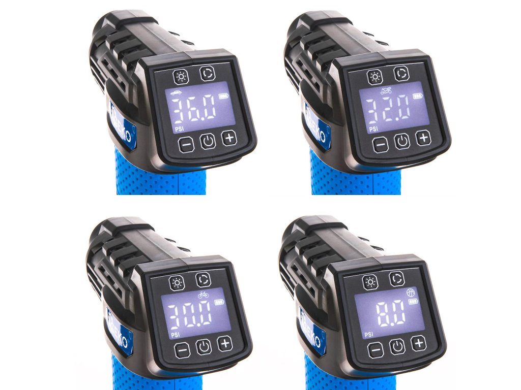 Ručně nastavte požadovaný pracovní tlak. Zapněte LED světlo. Zařízení nabízí 4 přednastavené režimy – pro automobily, motocykly, jízdní kola a míče.