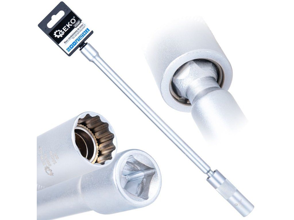 Tenkostěnný otočný klíč na zapalovací svíčky 16 mm s 3/8" pohonem, vyrobený z chrom-vanadiové oceli (CrV). Tenkostěnná konstrukce umožňuje práci v úzkých a hlubokých otvorech pro zapalovací svíčky a integrovaný univerzální kloub umožňuje volný pohyb pod úhlem v těžko přístupných místech motorového prostoru.