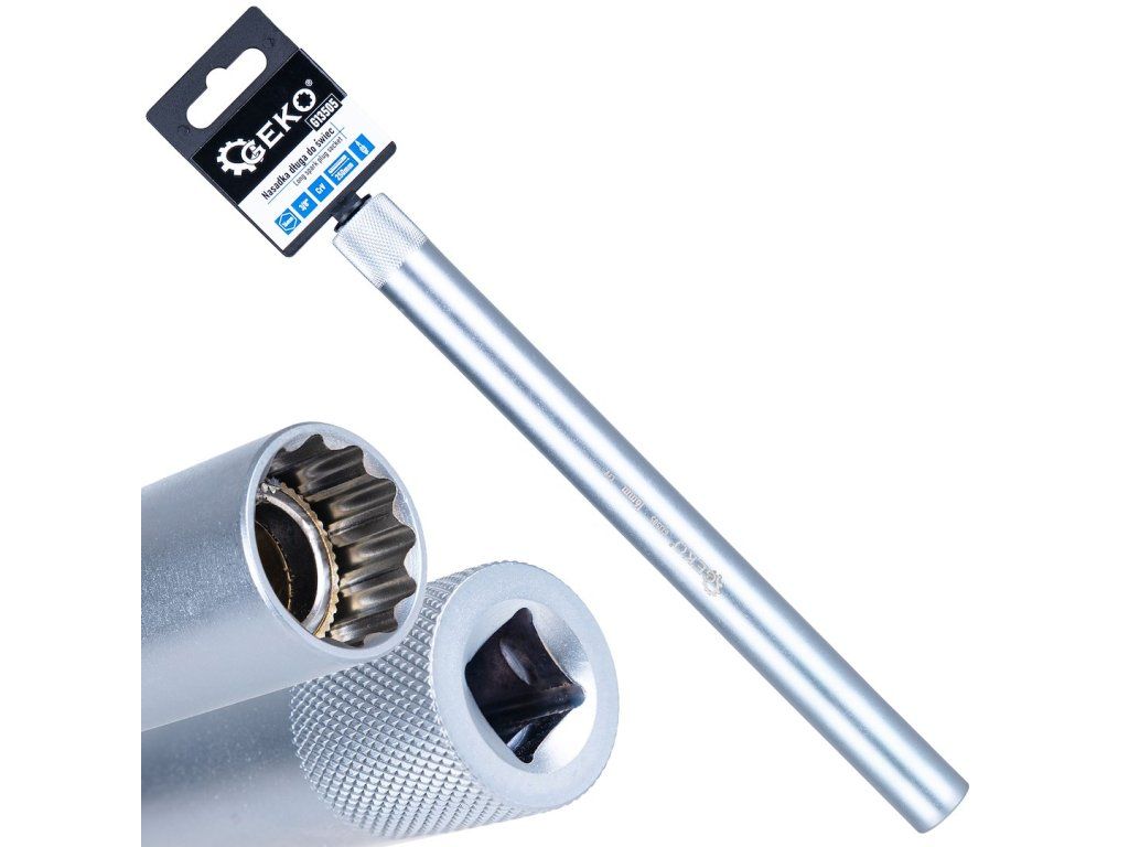 Hluboká svíčková hlavice 16 mm s 3/8" pohonem, délka 250 mm, vyrobená z chrom-vanadiové oceli (CrV). Tenkostěnná konstrukce umožňuje práci v hlubokých a úzkých svíčkových jamkách a prodloužené tělo zajišťuje snadný přístup ke svíčkám umístěným hluboko v hlavě motoru.