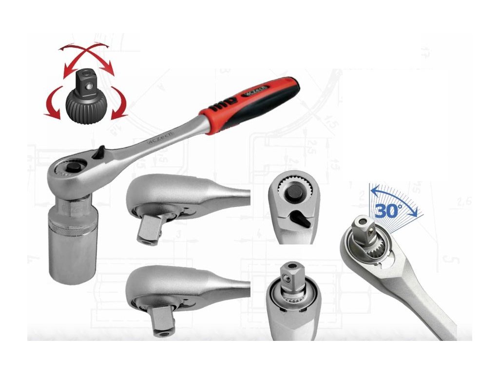 ISO 3315 - DIN 3122 Ráčnový mechanismus se 72 zuby Délka kroku zpětného chodu ráčny 5° Kompaktní hlava na otočném čepu pro snadnější ovládání v prostorech s omezeným přístupem...