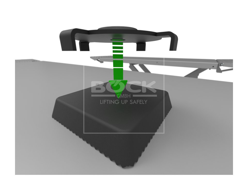 Adaptér se umístí na gumový blok na zvedáku (vhodný pro bloky s průměrem do 140 mm). Vystouplý střed adaptéru musí být umístěn nad otvorem bodu zvedání. Pokud vzdálenost mezi autem a zvedací platformou zvedáku není dostatečná pro gumový blok a adaptér, doporučuje se pro najíždění použít rampa výšky 50 mm (kat. číslo 10.329).