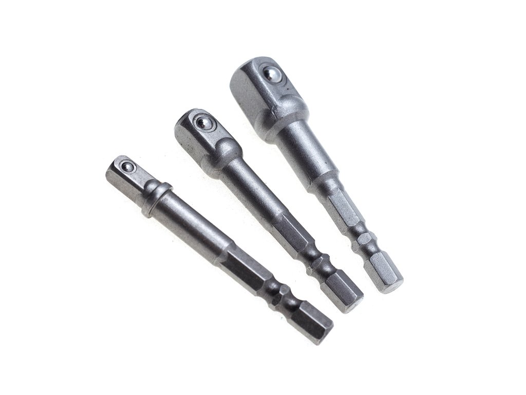 Adaptéry na gola hlavice (ořechy) s vodicím čtyřhranem 1/4”, 3/8” a 1/2” pro vrtačku nebo aku šroubovák, sada 3 kusy, zataveno v blistru – Extol Craft EX32600