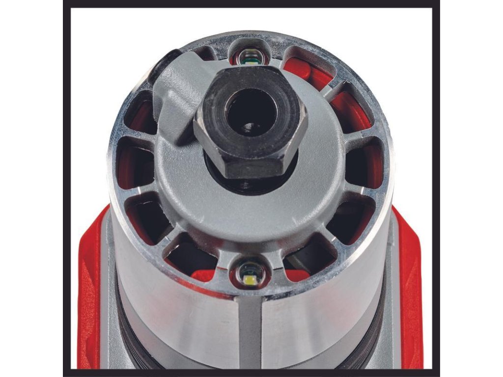 Systém vodících lišt umožňuje rozměrově přesné frézování. Je vybavena dvěma kleštinami (6 a 8 mm) pro různé frézy a díky aretaci vřetena umožňuje snadnou výměnu nástrojů. Pracovní plocha je optimálně osvětlena LED diodou, zatímco plastová vložka chrání povrch obrobku před poškrábáním i při nepříznivých a náročných aplikacích. Ergonomická rukojeť zajišťuje pohodlnou práci, zatímco kryt chrání před třískami v zorném poli.