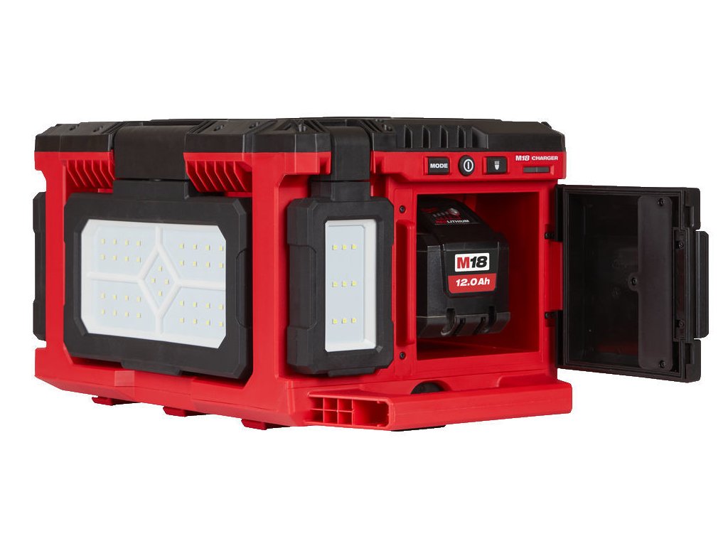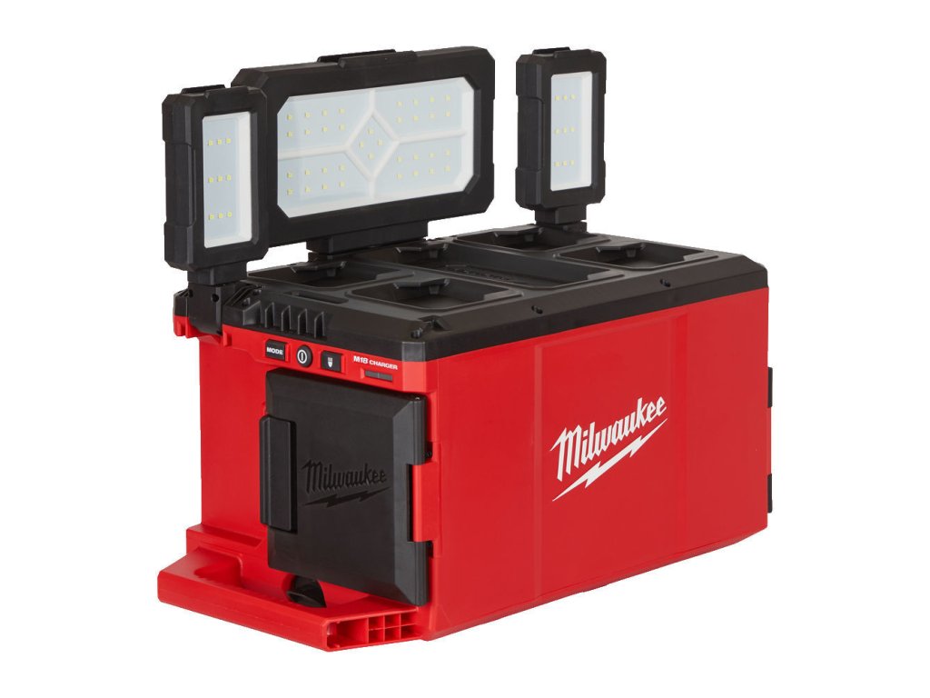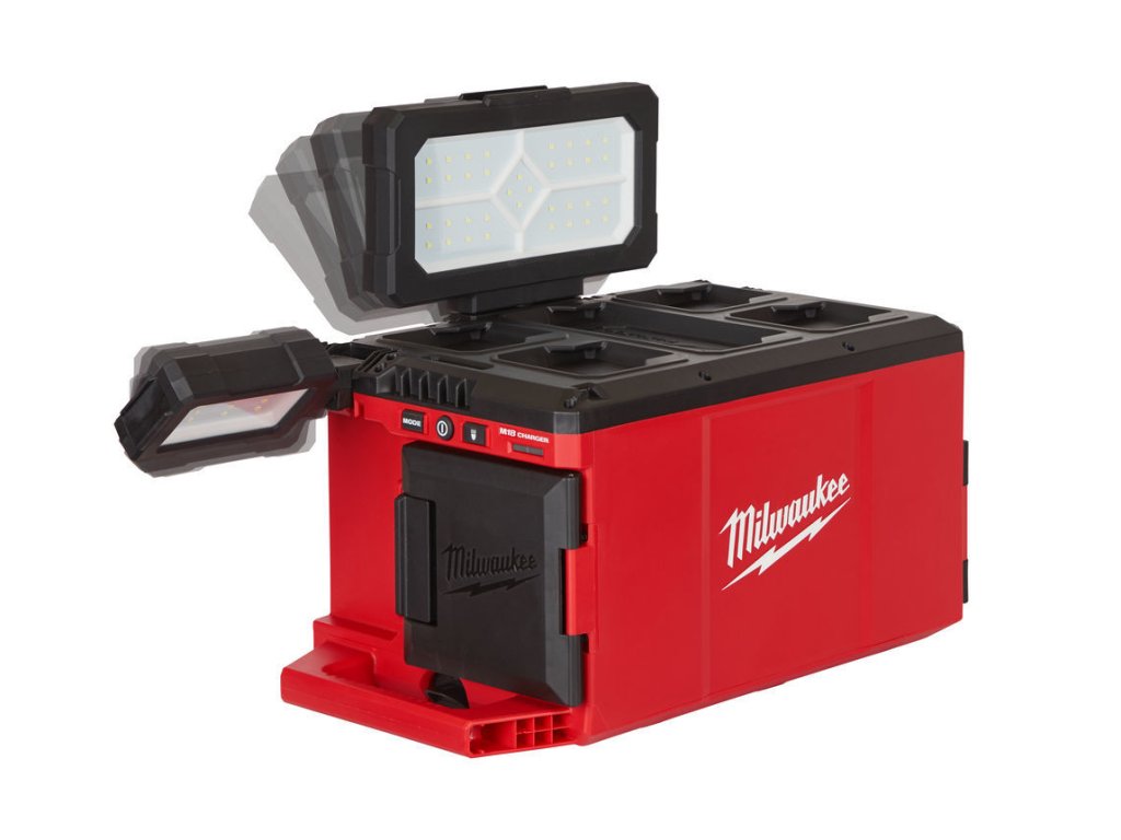 Bateriová – akumulátorová/elektrická lampa (reflektor), vysoká svítivost 3000 Lumen, 3 nezávislé otočné hlavy, s integrovanou nabíječkou – Milwaukee M18 POALC-0 PACKOUT
