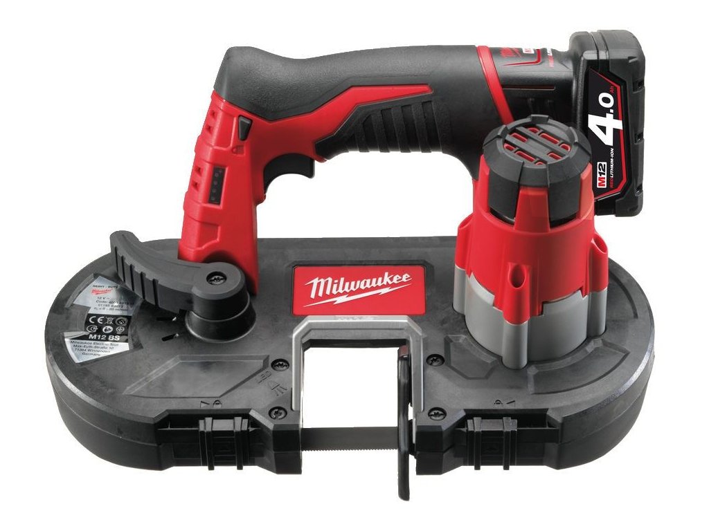 Bateriová – akumulátorová pásová pila na kov, jednoruční, sada se dvěma Li-Ion bateriemi 4,0 Ah a nabíječkou v kufru – Milwaukee M12 BS-402C