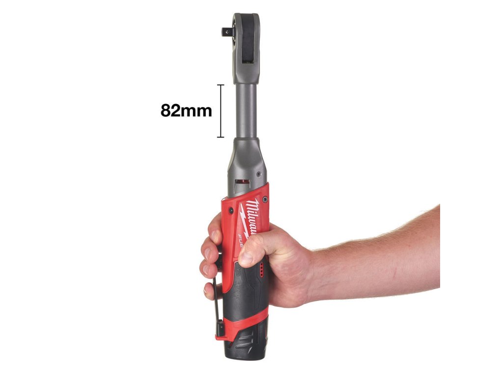 Bateriová – akumulátorová ráčnová utahovačka, vodicí 4hran 3/8“, točivý moment 75 Nm, s prodlouženou hlavou 8,2 cm – Milwaukee M12 FIR38LR-0 FUEL