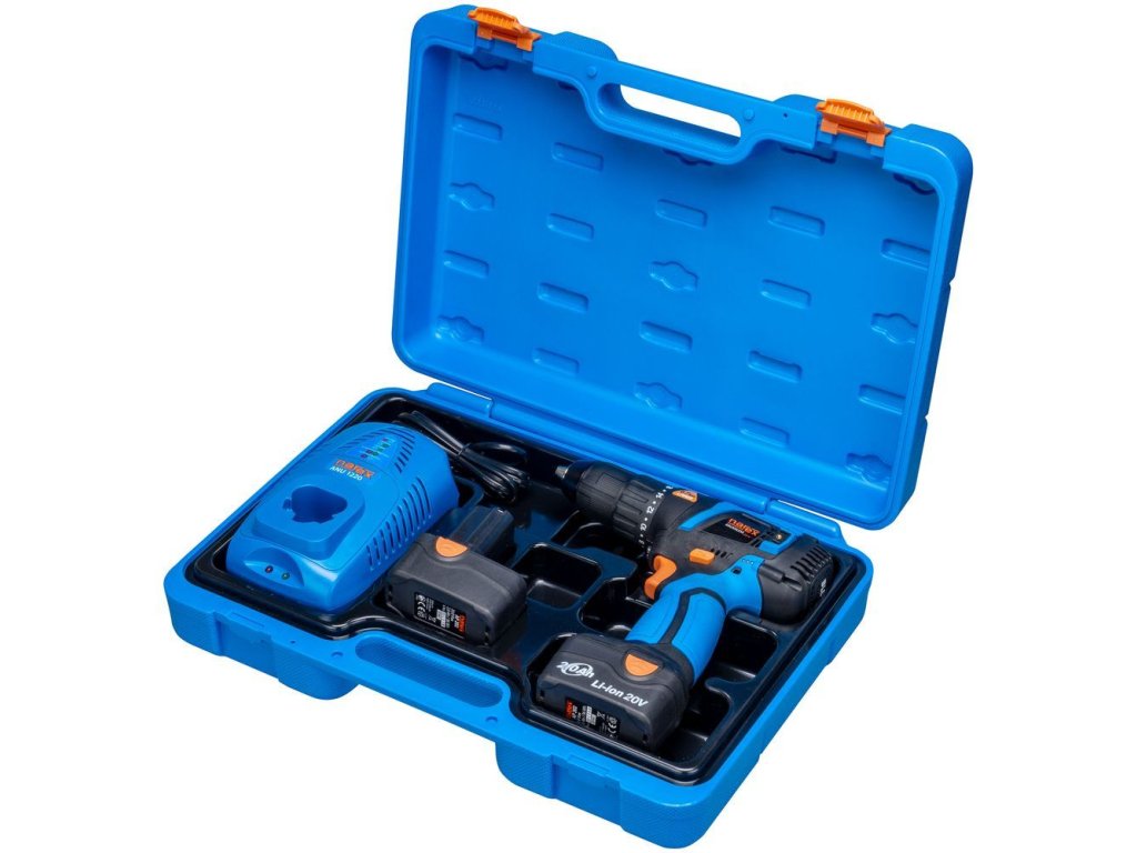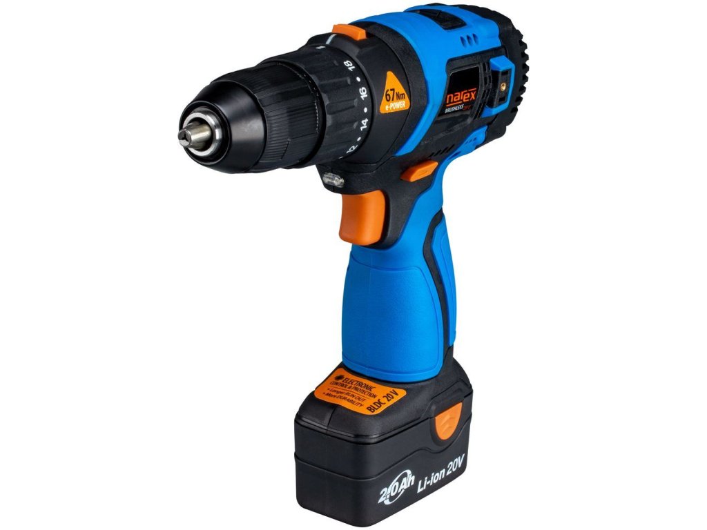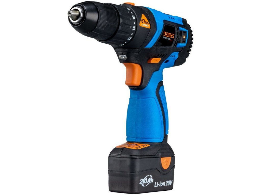 Bateriová – akumulátorová vrtačka a šroubovák, bezuhlíková (brushless) konstrukce, pro napětí 20 V, sada se 2 bateriemi Li-Ion 2,0 Ah a nabíječkou v plastovém kufru – Narex ASV 202-2B