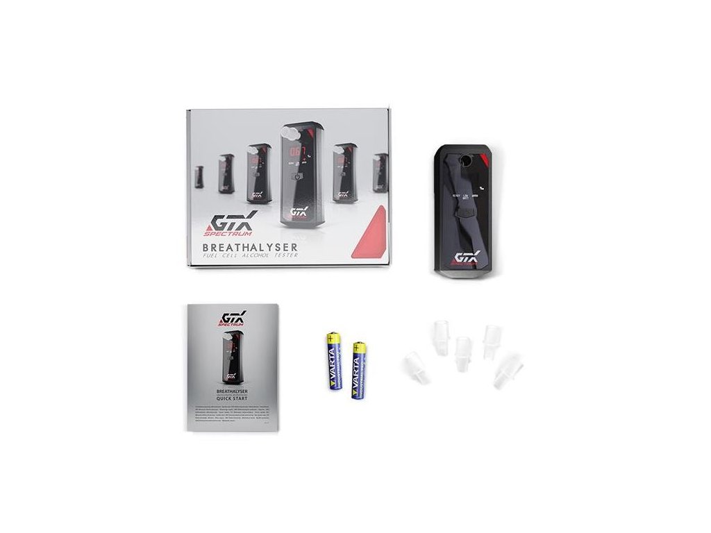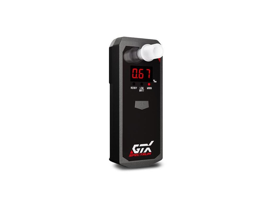 Alkoholtester, tzv. breathalyzer, pro orientační dechovou zkoušku na alkohol v dechu, s elektrochemickým senzorem, v sadě s náustky a bateriemi – GTX Spectrum
