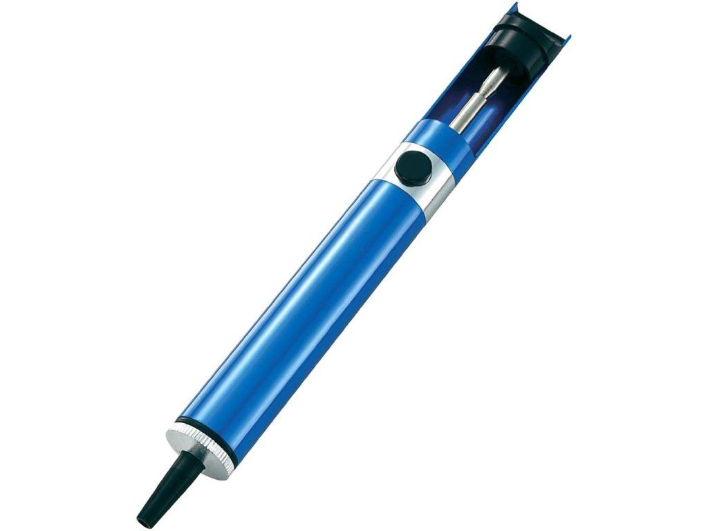 Antistatická odsávačka na odsávání přebytečného cínu v kovovém provedení (odolné hliníkové pouzdro) se samočisticím hrotem a lehce obsluhovatelným spouštěcím tlačítkem.