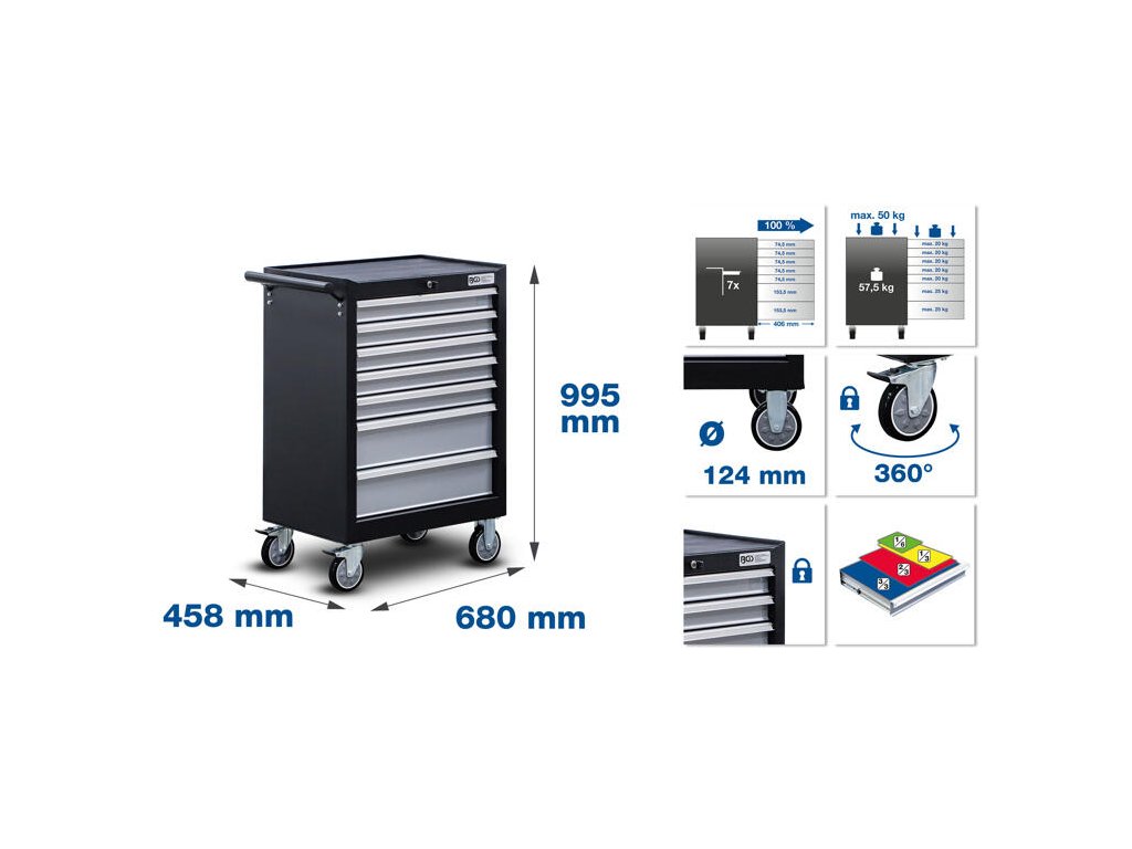 Komplet je dodáván v bytelném dílenském vozíku značky BGS technic se 7 šuplíky – 6 je vybavených, 1 hluboký je ponechán volný a můžete do něj uložit, co potřebujete (např. větší kusy autoservisního nářadí, jako hydraulické stahováky apod.). Zásuvky mají centrální zamykání a pojistky proti nechtěnému otevření. Vrchní strana je využitelná jako pracovní deska nebo k odložení předmětů.