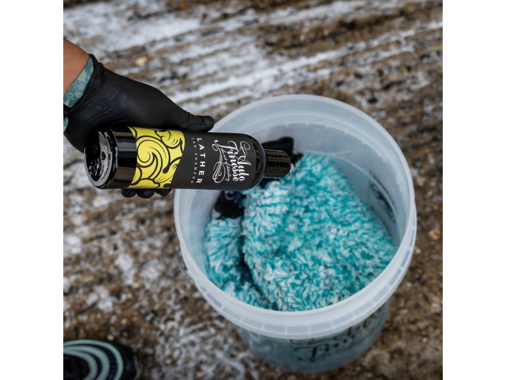 Lather vždy používejte ve spojení se dvěma detailovacími kbelíky a pročešte kvalitní mycí rukavicí. Tato zásadní opatření jsou nejúčinnějšími preventivními opatřeními pro bezkontaktní mytí, která pomáhají co nejbezpečnějšímu čištění a zahrnují použití jednoho kbelíku pro šamponový roztok a druhého kbelíku naplněného čistou vodou pro opláchnutí rukavice mezi dalším setřením.