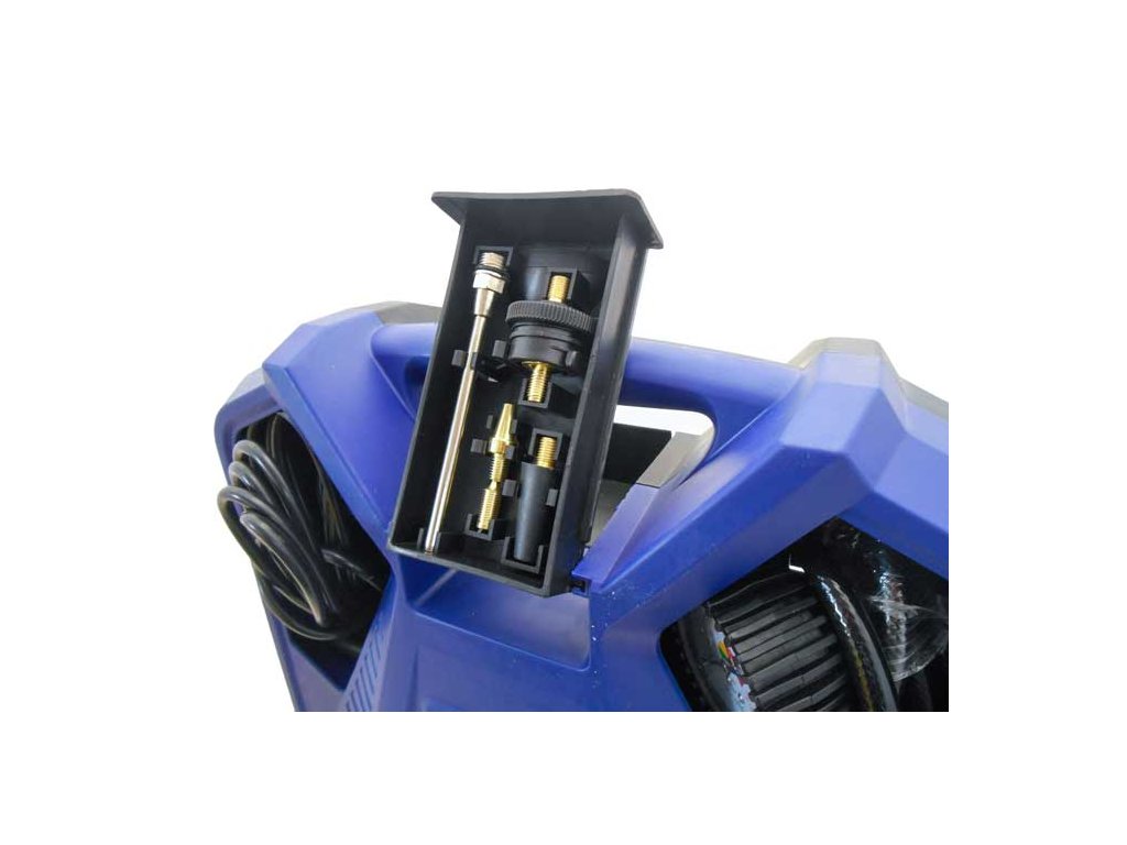 Kompresor má pod madlem vyklápěcí přihrádku na uložení adaptérů pro nafukování.