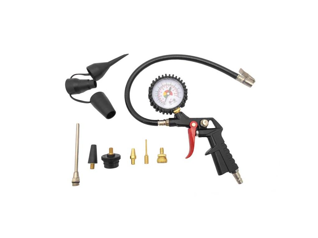 Příslušenství dodávané s kompresorem: 8 adaptérů pro různá určení, prodloužená tryska, foukací pistole (pneuhustič) s manometrem, hadičkou a hustící koncovkou.