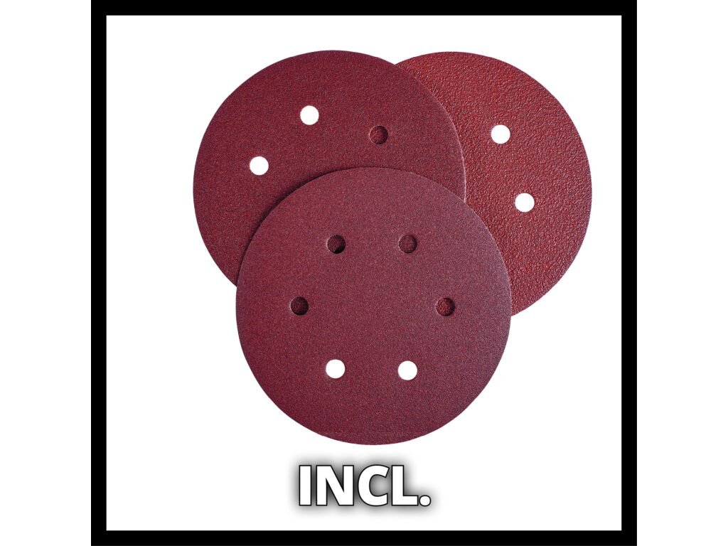 Výrobek je dodáván s 6 listy brusných papírů (2x zrnitost P80 / P100 / P120 každý), jednou vsuvkou a jedním klíčem.