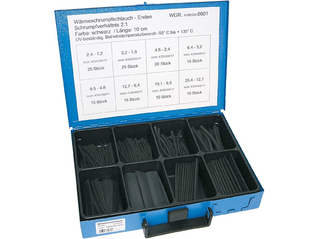 Smršťovací bužírky – hadičky, různé průměry, smršťovací poměr 2:1, délka 10 cm, černá barva, souprava 135 kusů v plechovém kufříku – Dresselhaus 44990008601