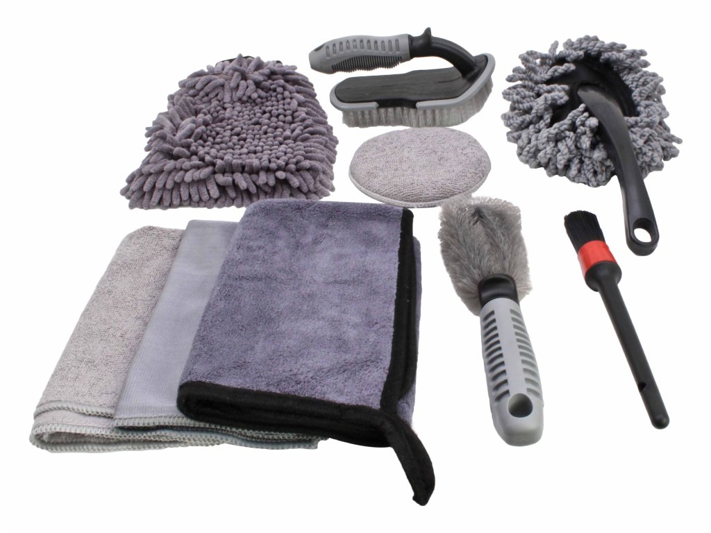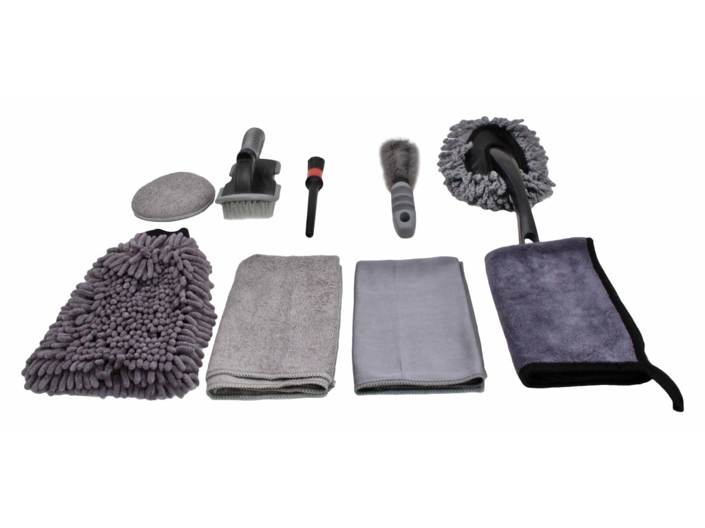 Čisticí a lešticí sada na auto – kartáče, utěrky, rukavice a štětec, sada 8 ks – Satra