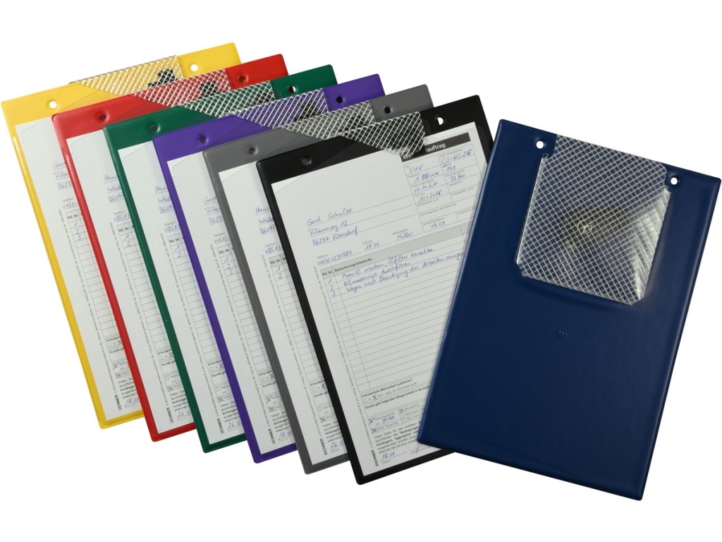 Desky na zakázkové dokumenty (A4) s průhlednou fólií, se suchým zipem, s poutkem a s kapsou na klíče, v různých barvách.