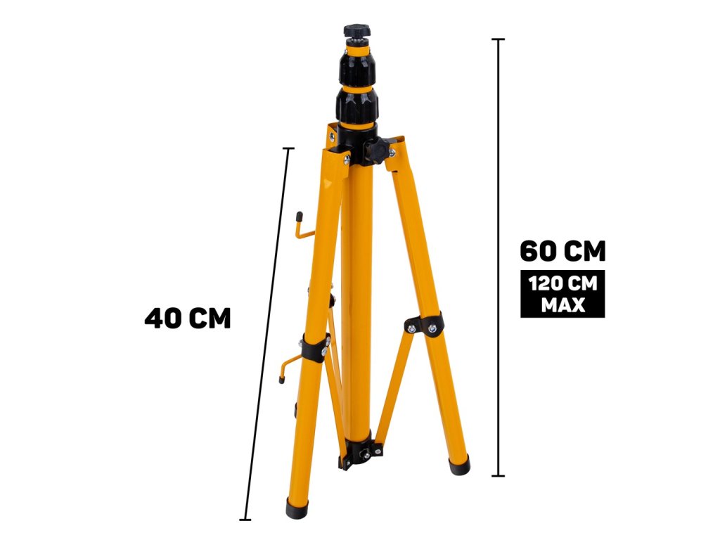 Teleskopický stativ je vyroben z odolného kovu a umožňuje stabilní a pohodlné nasazení. Nastavitelná výška od 60 cm do 160 cm umožňuje flexibilní použití podle potřeb osvětlení. Díky plynule fungujícím plastovým šroubům je regulace výšky rychlá a intuitivní.