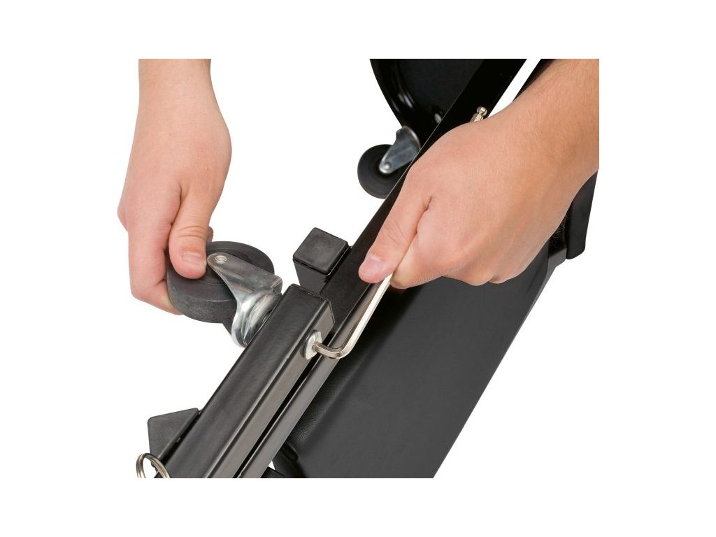 Robustní rám z ocelových trubek zaručuje spolehlivost pro ležení nebo sezení při práci. Šest koleček o průměru 63 mm umožňují pohodlné přemísťovaní.