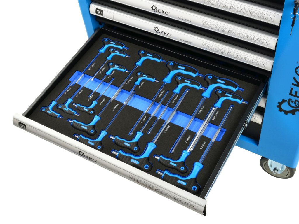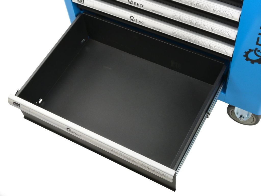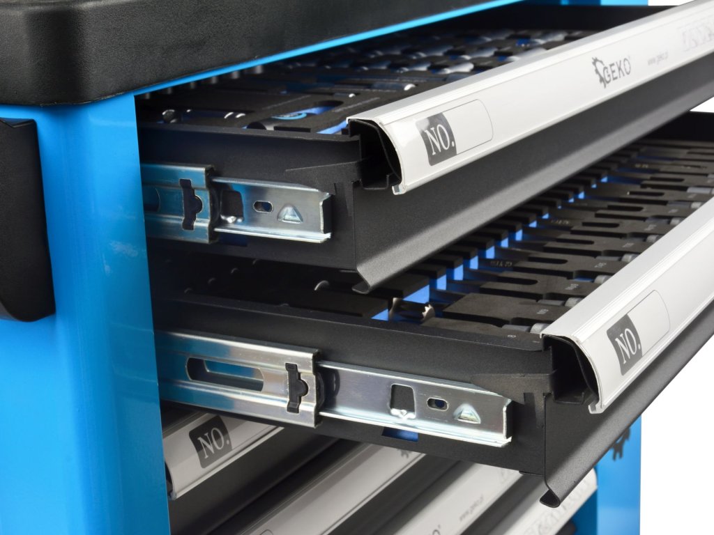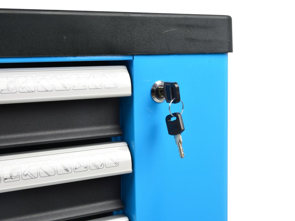 Všechny zásuvky jsou uloženy na pojezdech s kuličkovými ložisky, z jejich čelních lišt lze vyjmout papírový pás a napsat na něj obsah jednotlivých šuplíků. Zásuvky jsou centrálně uzamykatelné, boční skříňka se zamyká zvlášť a je vhodná k uložení např. sprejů s auto chemií. Všechny klíčky jsou dodávány s vozíkem.