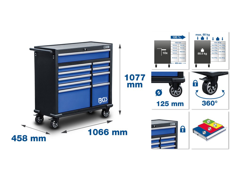 Dílenský montážní vozík – pojízdná skříňka na nářadí, extra velký XXL s 10 centrálně uzamykatelnými šuplíky, nevybavený – BGS technic 4206