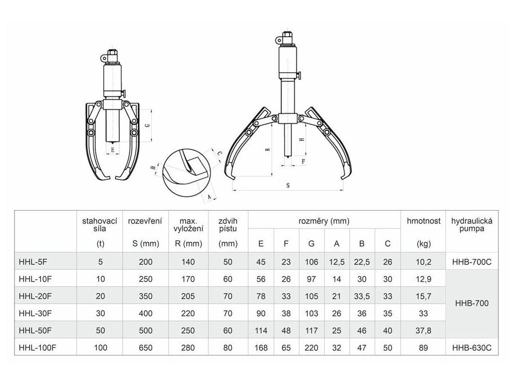 Určeno pro stahování ložisek, řemenic, ozubených kol atd., dodáván včetně ruční hydraulické pumpy HHB-700.