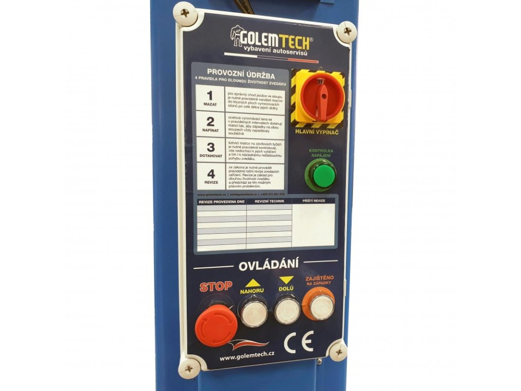 Nový model zvedáku Golemtech 4000 je vybaven elektronicky ovládanými bezpečnostními západkami. Tím se znatelně zvyšuje komfort obsluhy, kdy není potřeba obcházet zvedák a odjišťovat západky ručně, jako je tomu u zvedáků nižších kategorií. Obsluhující mechanik vše ovládá elektronicky, pomocí jednoho tlačítka z řídicího stanoviště. Stroj vyniká osvědčenou konstrukcí a spolehlivou hydraulikou. Jeho provoz je díky tomu bezproblémový a údržba nenáročná.