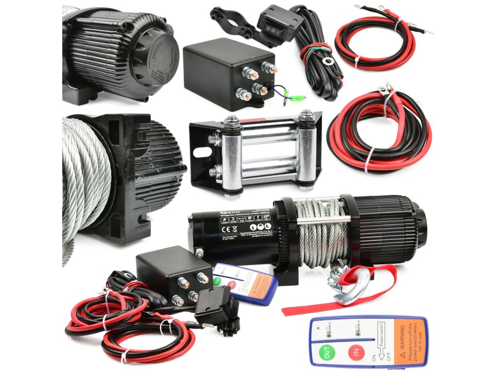Elektrický lanový naviják pro čtyřkolky a menší terénní vozidla, motor 1500 W/12 V, zatížení až 2041 kg – GEKO G81705
