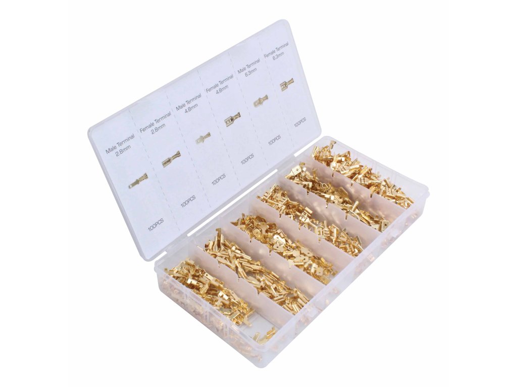 Elektrické konektory typu faston (fastony), vel. 2,8, 4,8 a 6,3 mm, krimpovací – lisovací, měděné, sada 600 kusů, v plastové krabičce – ASTA A-TC523.