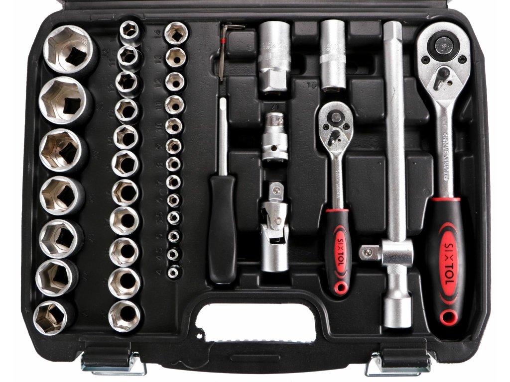 Sada obsahuje celou škálu nástrčných hlavic, zástrčných klíčů, bitů, dvě ráčny, univerzální šroubovací rukojeť, klíče na svíčky a další užitečné nástroje.