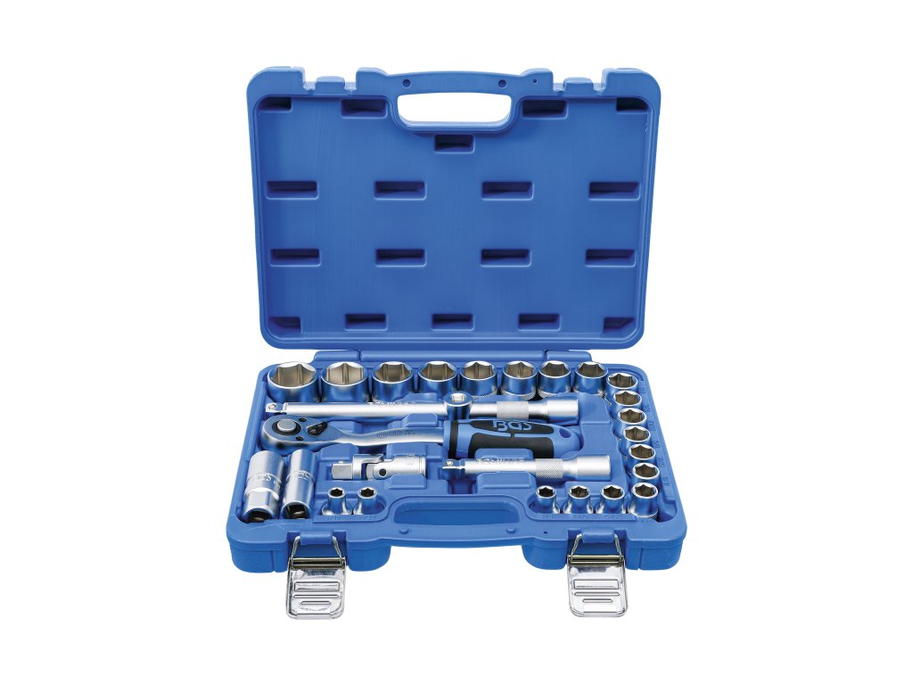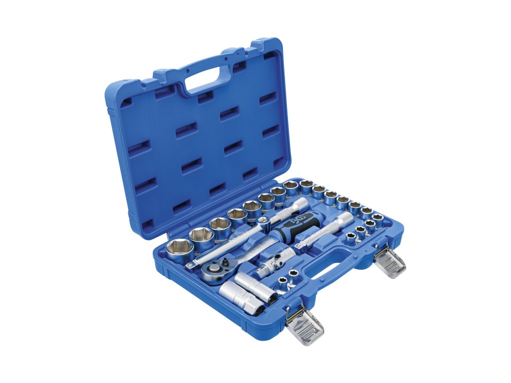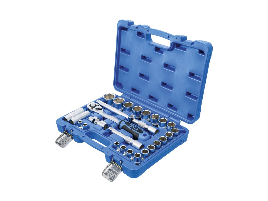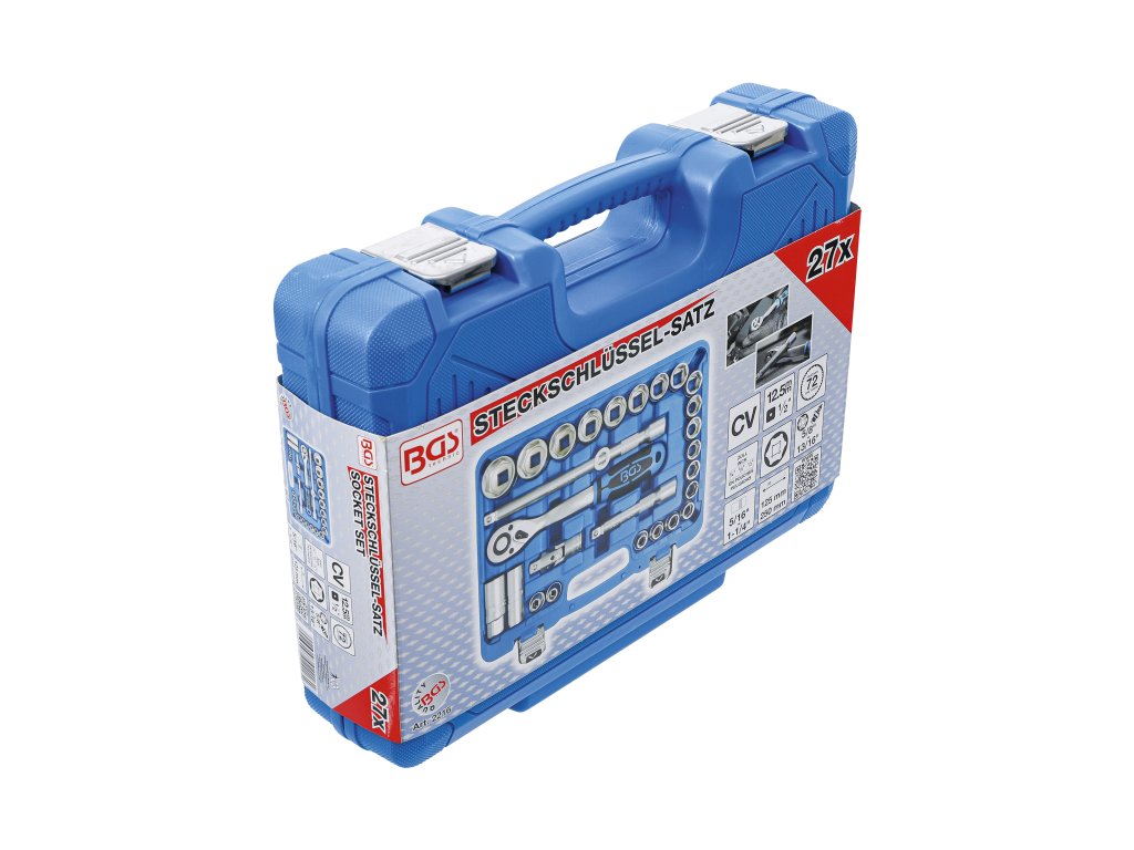 Gola sada s nářadím v palcových rozměrech, vodicí čtyřhran 1/2“, 27 dílů v plastovém kufříku s kovovými přezkami – BGS technic 2216.