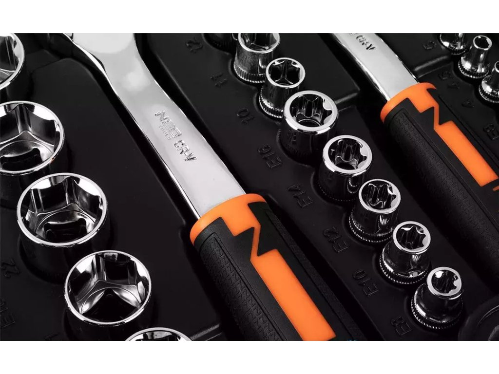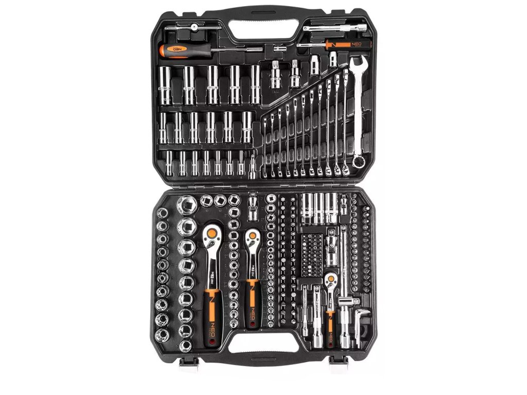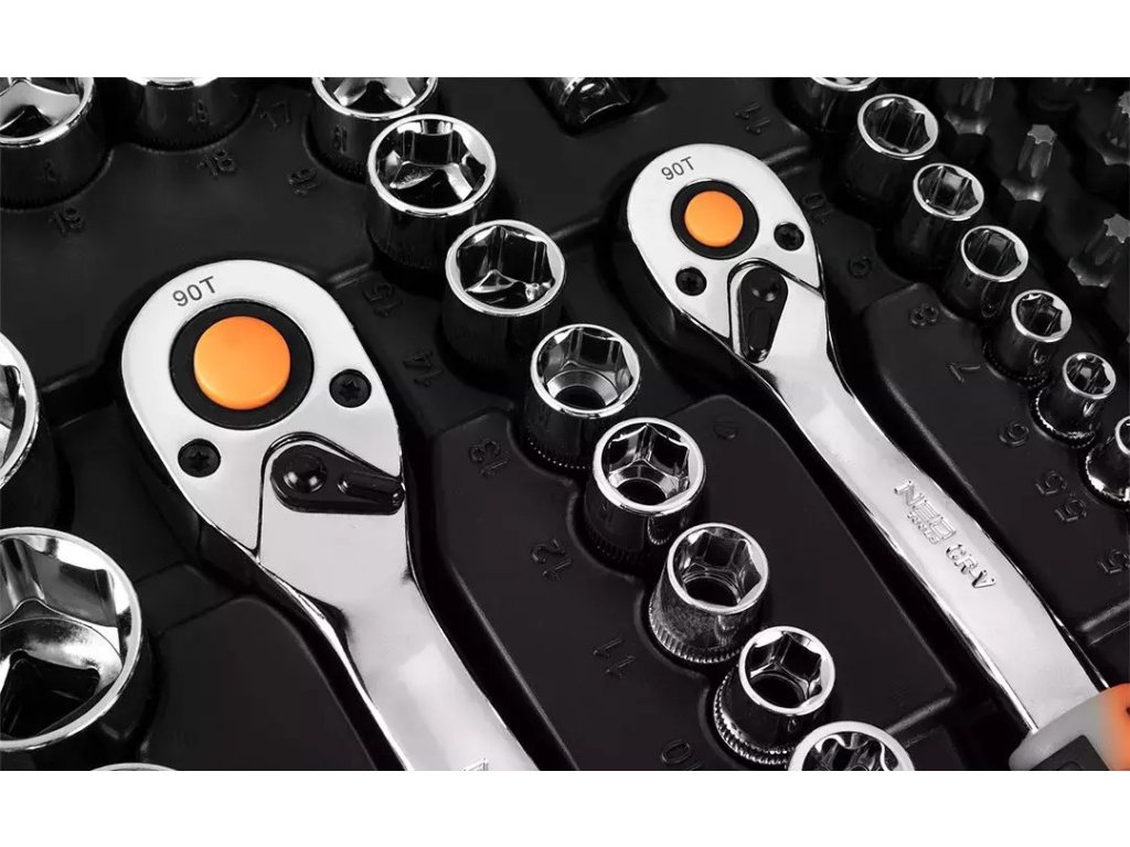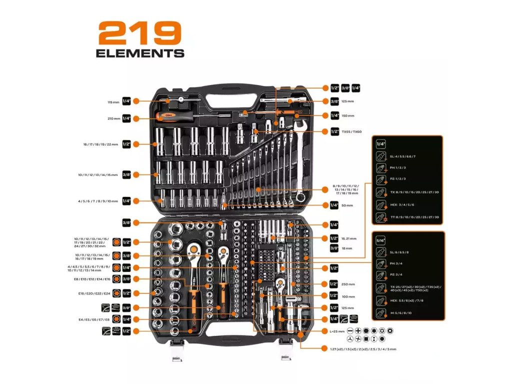 Gola sada s nářadím v metrických rozměrech, vodicí čtyřhrany 1/4", 3/8" a 1/2", 219 dílů v plastovém kufru s kovovými přezkami – NEO tools 10-076.