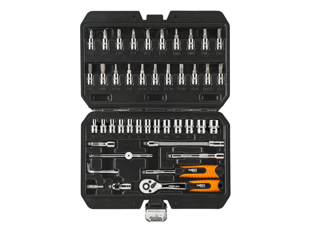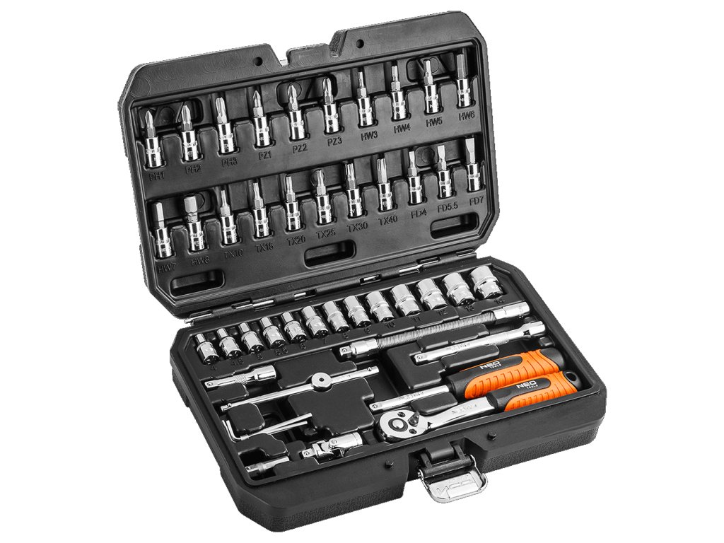 Gola sada s nářadím v metrických rozměrech, vodicí 4hran 1/4“, 46 dílů v plastové kazetě – NEO tools 08-660
