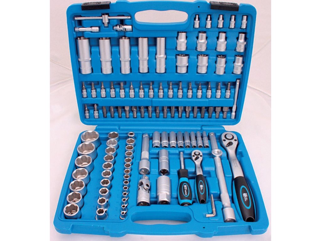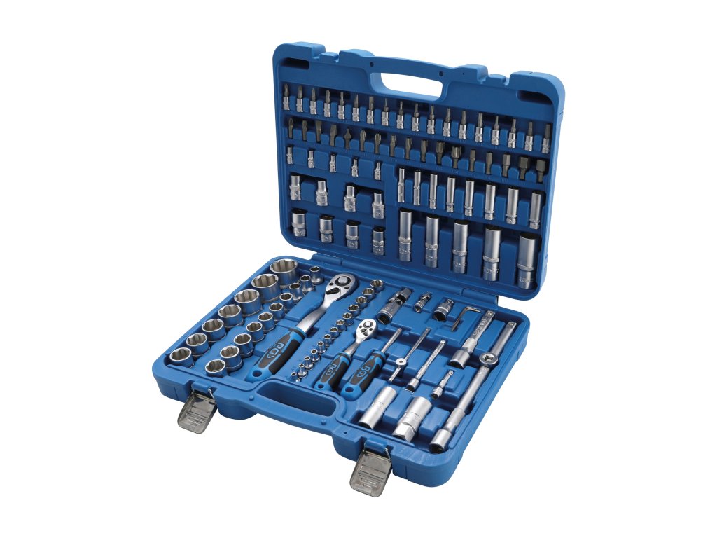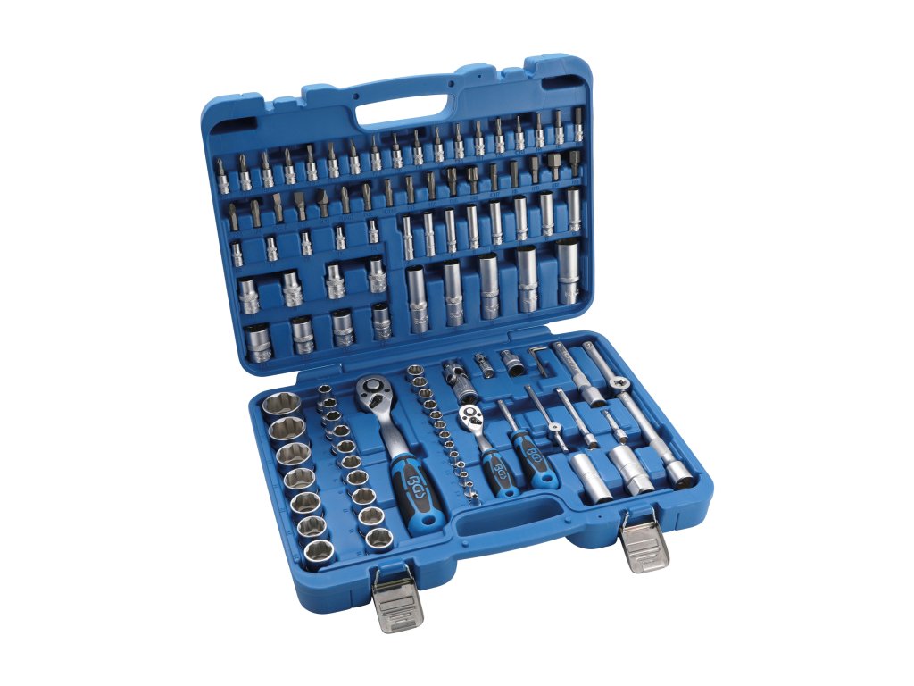 Gola sada s nářadím v metrických rozměrech, vodicí 4hrany 1/4“ a 1/2“, 108 dílů v plastovém kufru s kovovými přezkami – BGS technic 2298