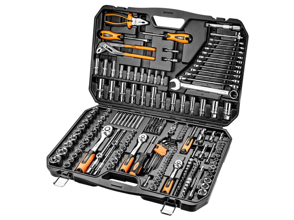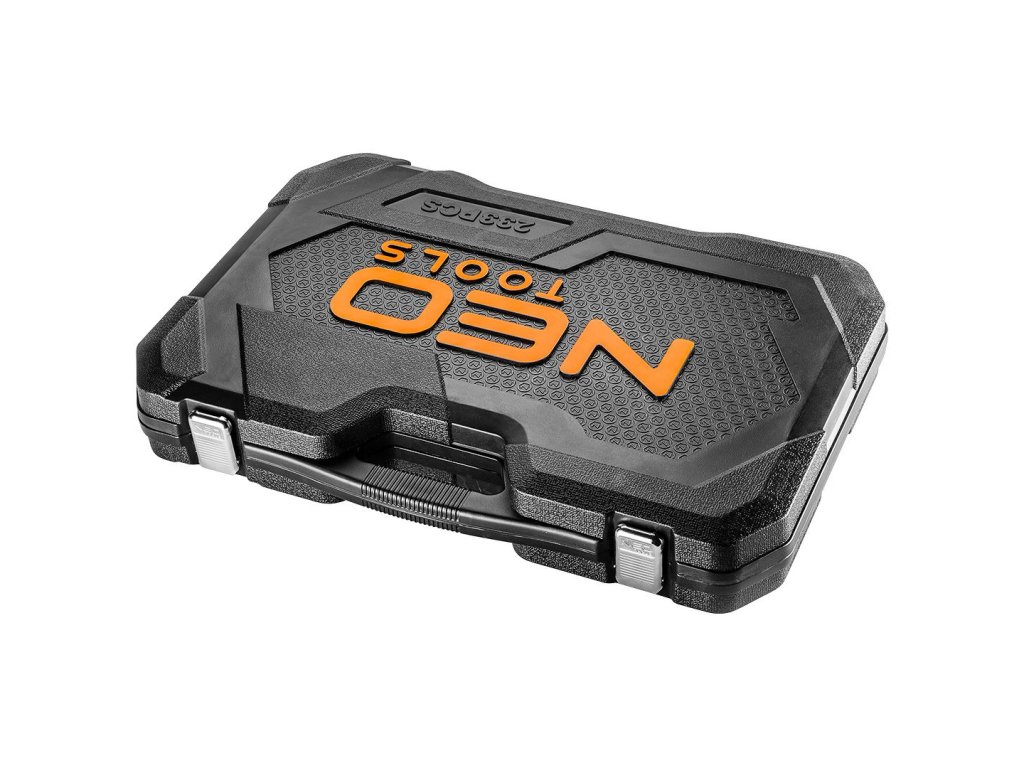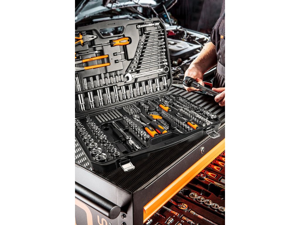 Gola sada s nářadím (hlavicemi) v metrických a palcových rozměrech, vodicí 4hrany 1/4", 3/8" a 1/2", velký rozsah 233 dílů v plastovém kufru – NEO tools 08-681