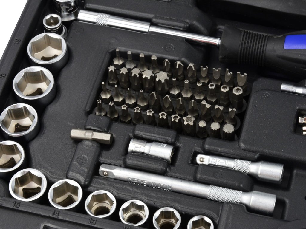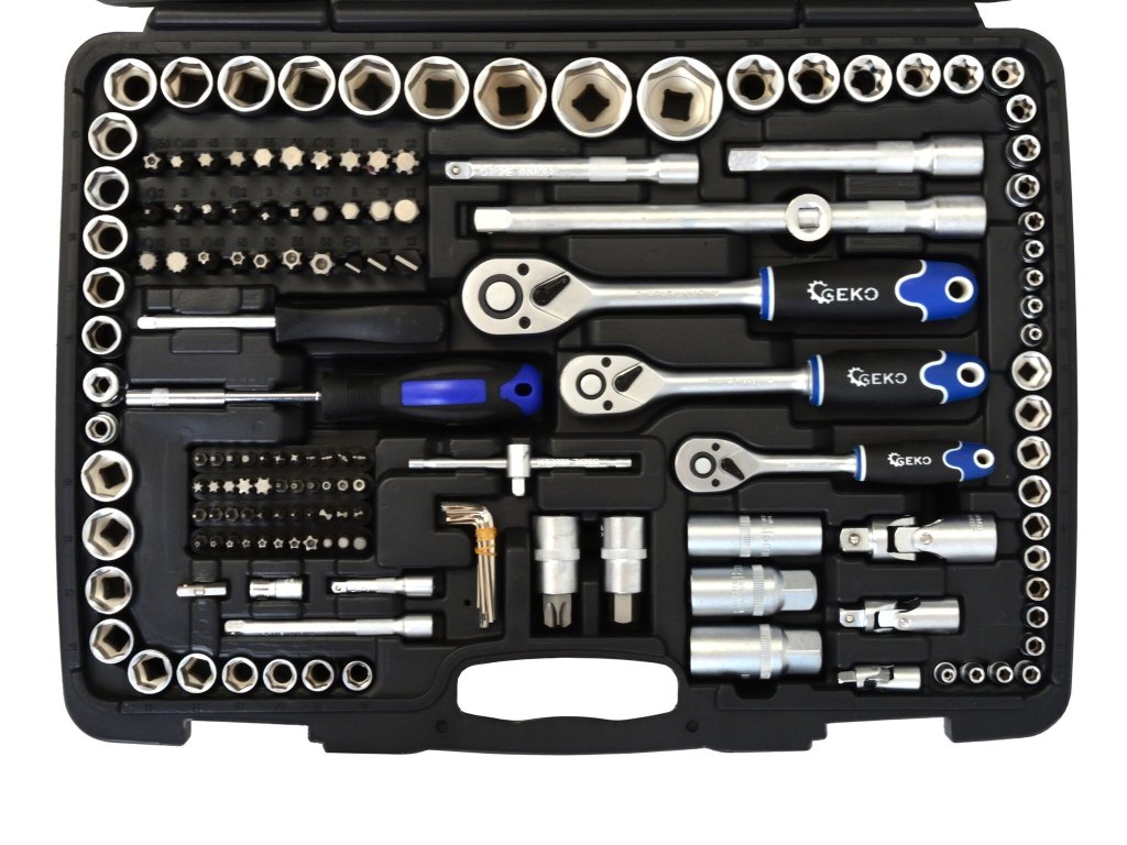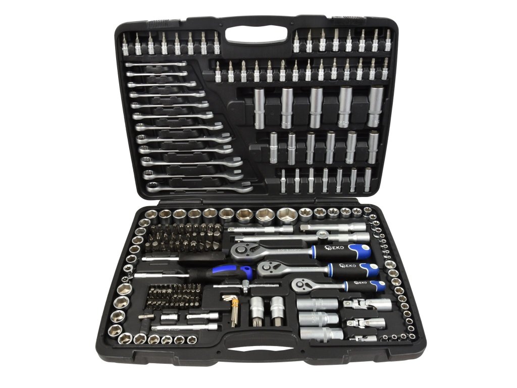 Gola sada s nářadím v metrických rozměrech, vodicí 4hrany 1/4“, 3/8“ a 1/2“, velký obsah 216 kusů v plastovém kufru – GEKO G10158