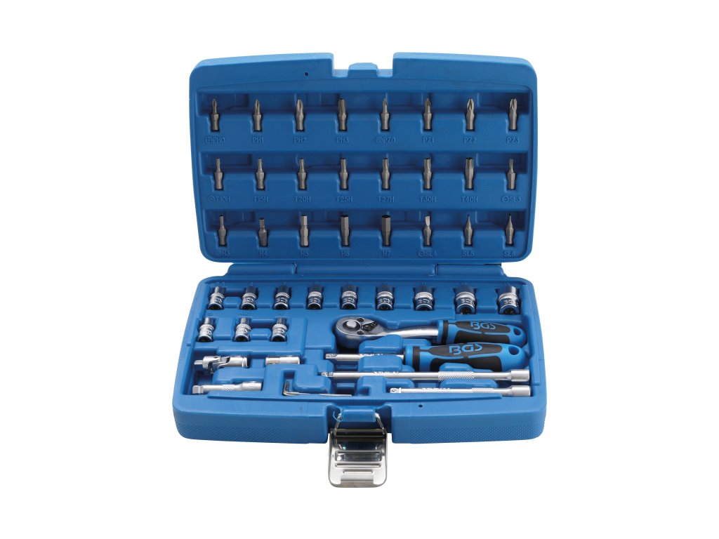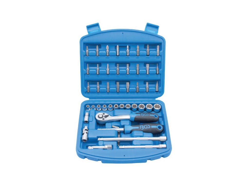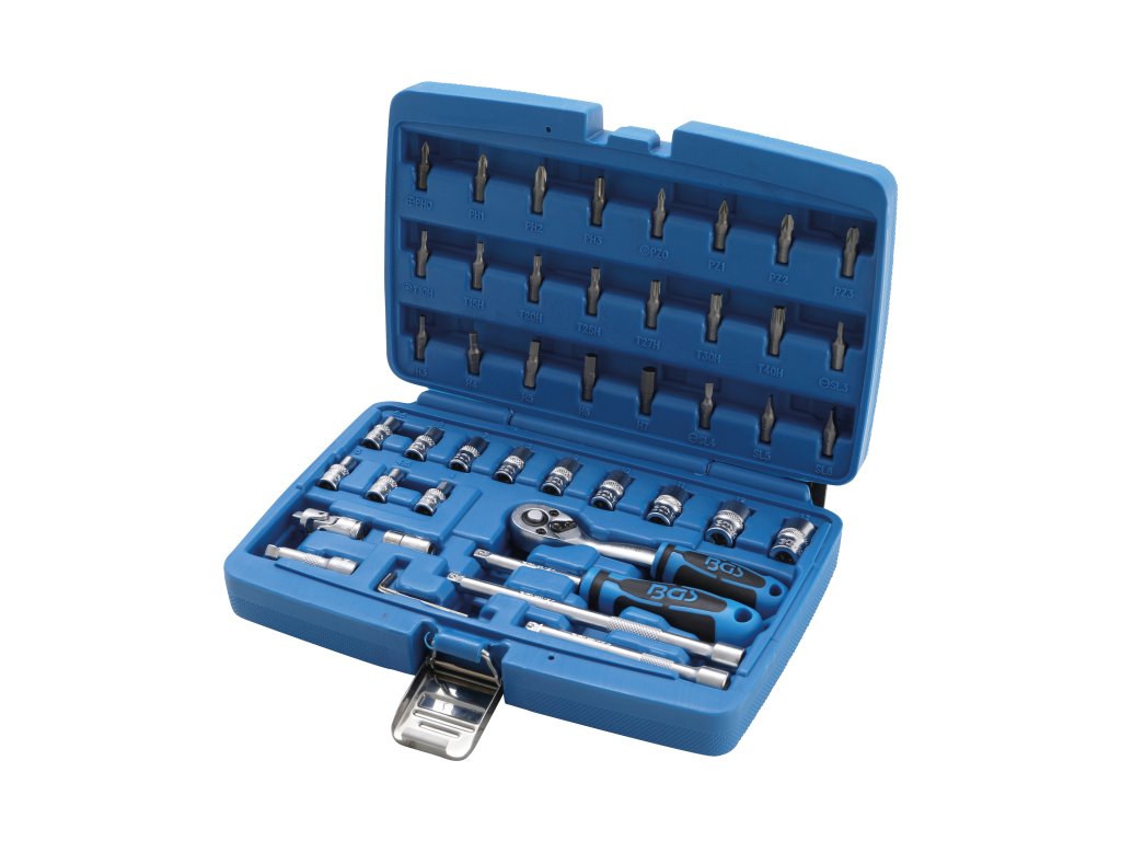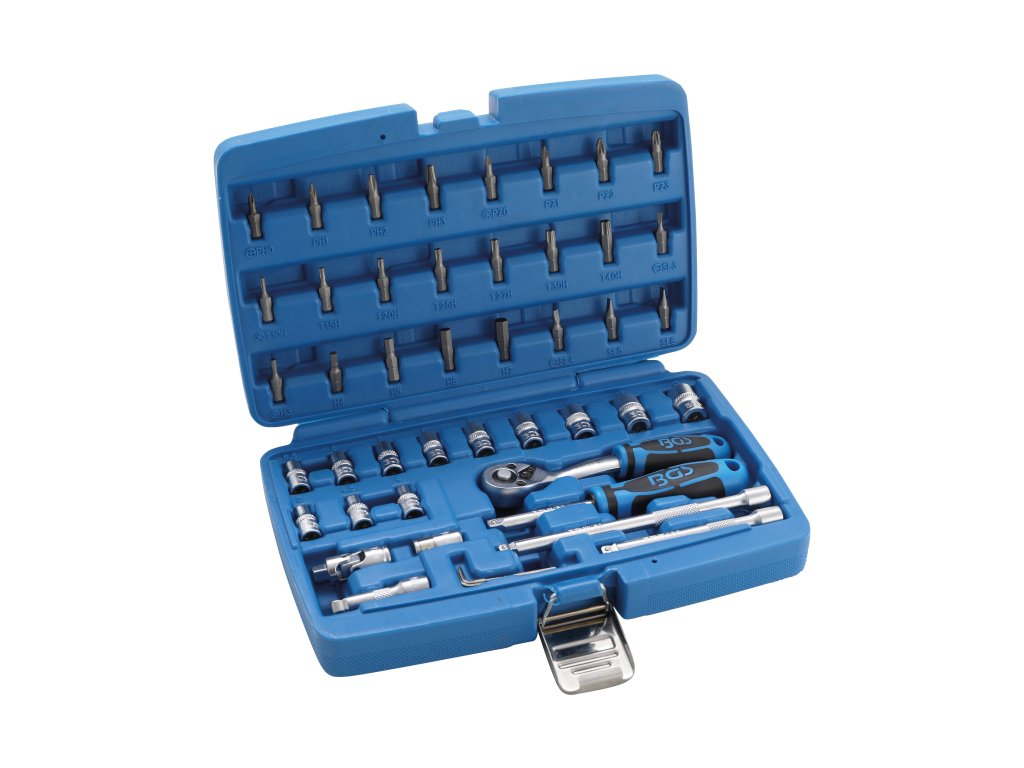 Gola sada s nářadím v metrických rozměrech, vodicí 4hran 1/4“, 46 dílů v plastové kazetě s kovovou přezkou – BGS technic 2144