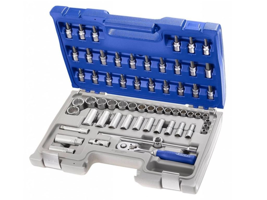 Gola sada s nářadím v metrických rozměrech, vodicí 4hran 3/8“, 61 dílů v plastovém kufříku s kovovou přezkou a panty – Tona Expert E031806