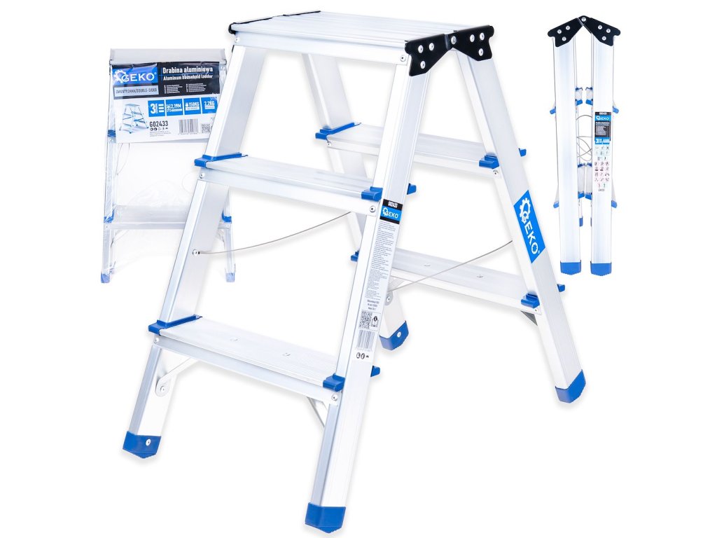 GEKO G02433 Oboustranný 3stupňový hliníkový žebřík | Nosnost 150 kg | Pracovní výška až 2 m