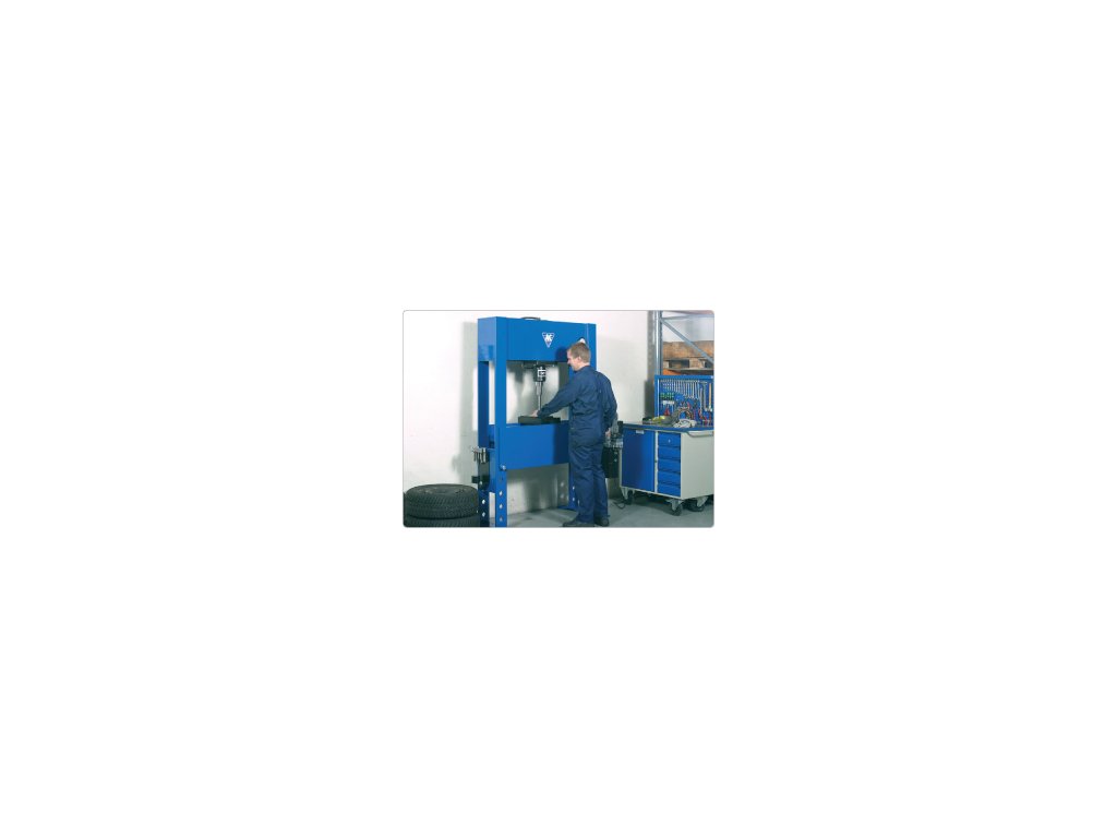 Vybaveno dvojčinnou hydraulickou pumpou s pedálovým ovládáním: obě ruce obsluhy mohou zůstat volné a přesně umístit obrobek pod píst se zdvihem až 300 mm. Koncovka pístu je odnímatelná – možnost montáží různých hlav. Lisovací hlava je posuvná do stran, díky čemuž je lis mimořádně variabilní. Tlak lze kontrolovat pomocí manometru umístěného v rámu ve výšce očí.