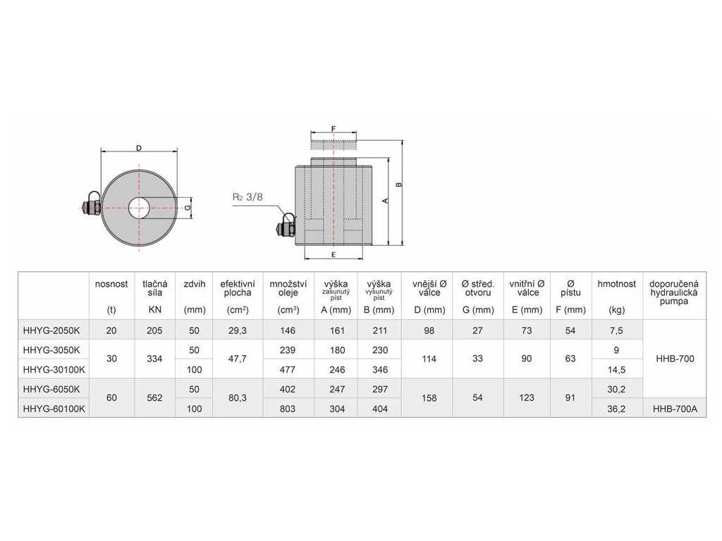 Univerzální jednočinný hydraulický válec s dutým pístem, nosnost 60 000 kg, standardní konstrukční výška – Genborx HHYG-60100K