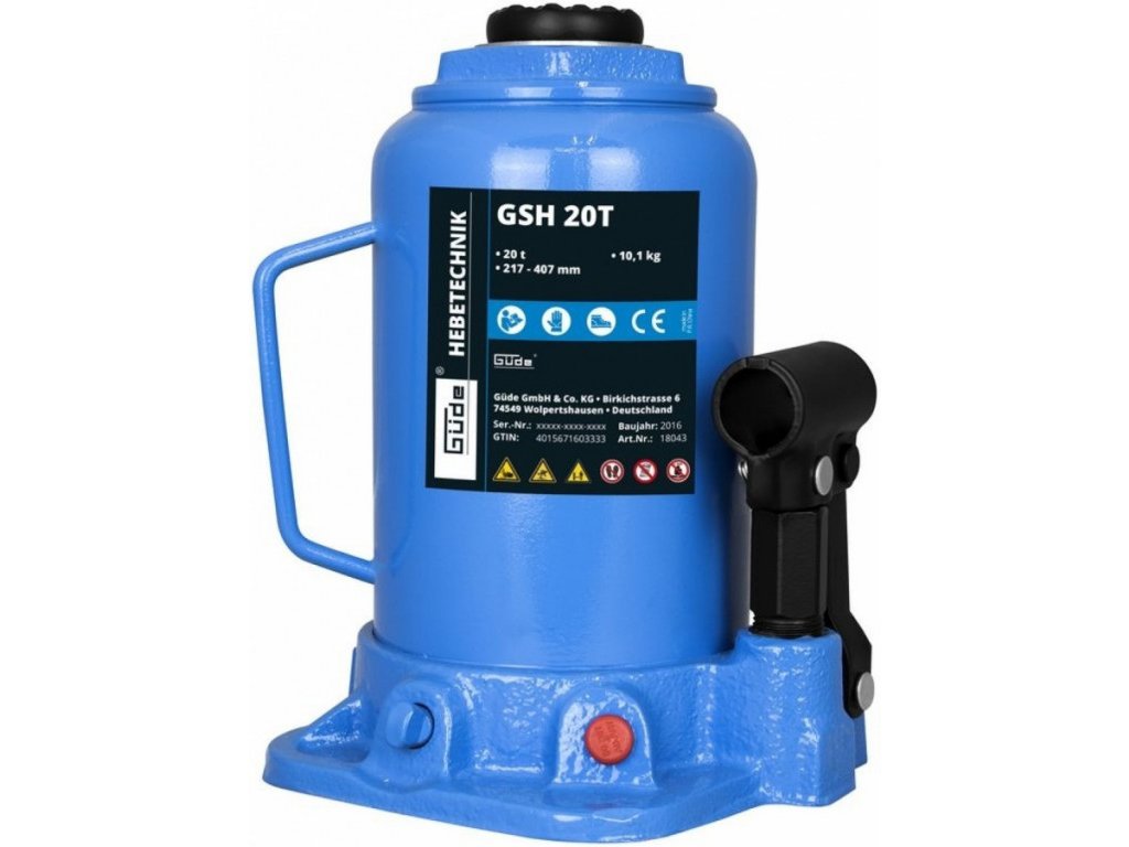 Hydraulická panenka – pístový sloupkový hever, nosnost 20 000 kg, výška 217-407 mm, s madlem – Güde GU18043