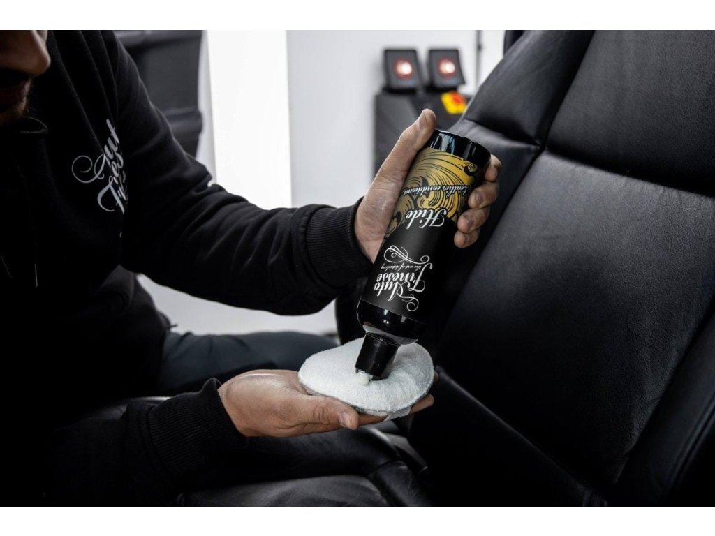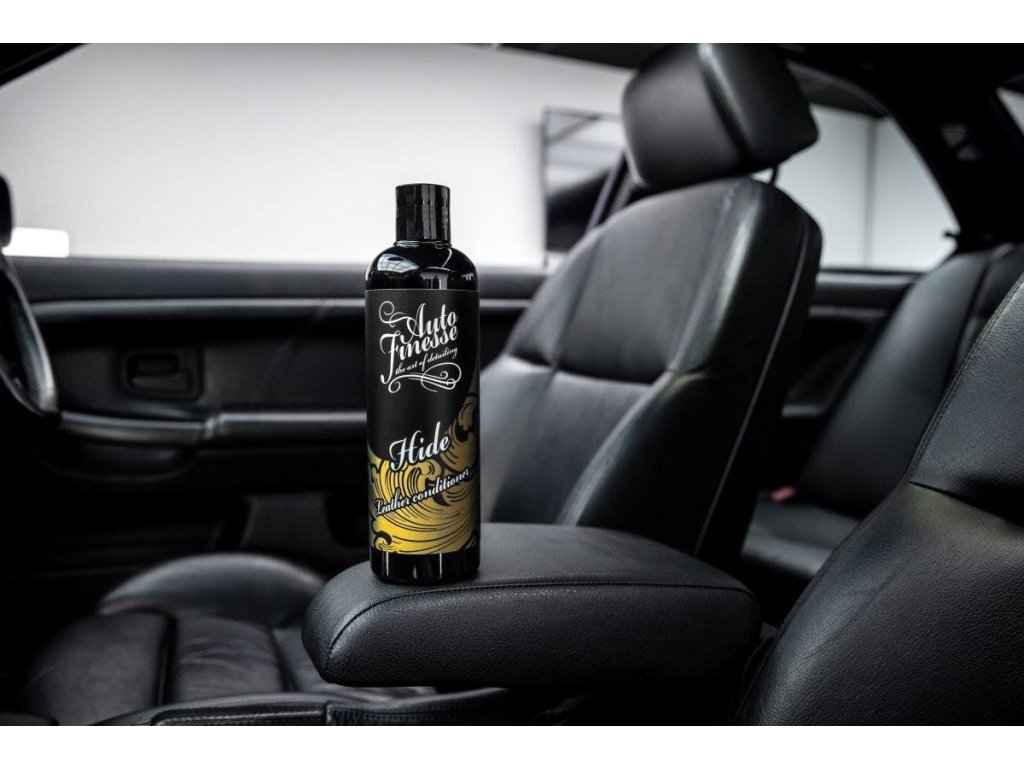 Auto Finesse® Hide Leather Conditioner je založen na vzorci obohaceném o lanolin a vosk, a nabízí dvě výrazně důležité funkce. První funkcí Hide Leather Conditioner je kondicionování kůže tím, že znovu zavádí esenciální oleje, změkčuje ji a obnovuje její původní barvu. Druhou funkcí je působit jako ochranný krém. Ten vytváří prodyšnou vrstvu, která zabraňuje vysychání kůže a brání přenosu barviva na světlé čalounění. Hide Leather Conditioner je vhodný pro všechny povrchy kůže, včetně semi-anilinových a anilinových (někdy také nazývaných ‘Nappa’, nekrytých nebo přírodních) povrchů.