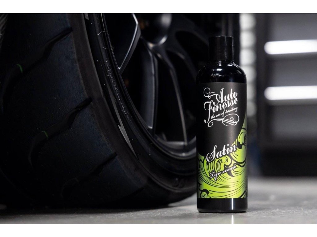Na rozdíl od tradičních úprav pneumatik, tento vysoce technologický, nesklouzávající formule je vrstvitelná, což z ní činí první svého druhu, který nabízí progresivní finiš. To znamená, že jedna vrstva poskytne čistý, přirozený saténově matný vzhled. Při aplikaci několika vrstev za sebou se však vytvoří velmi mokrý, vysoce lesklý efekt. Čím více vrstev přidáte, tím výraznější bude lesklý vzhled tzv. show car. A již od první aplikace Satin nejen vylepší vzhled vašich pneumatik, ale také poskytne ochrannou bariéru proti vlivům počasí.