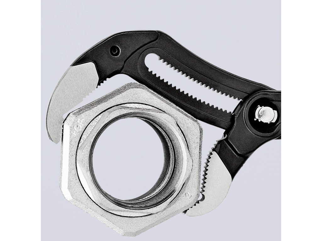 Čelist lze nastavit v 27 krocích na přesnou velikost pro použití na potrubí až 3,5“, nebo na matice až 95 mm. Snadné posouvání a aretace čelistí stisknutím tlačítka.