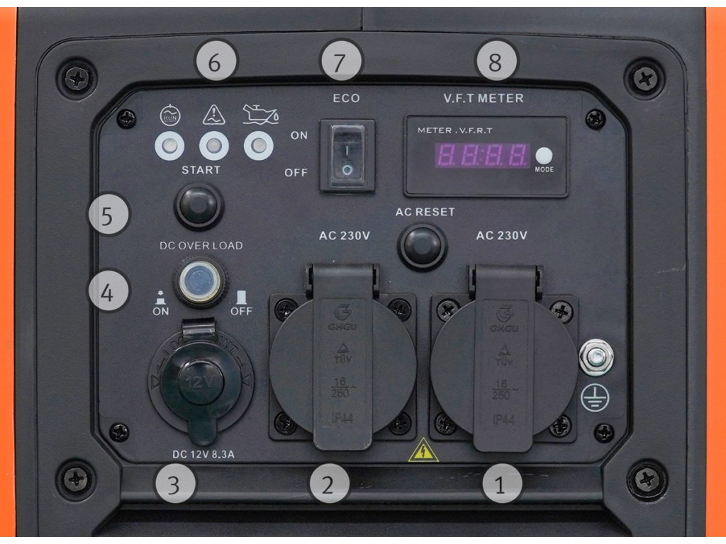 Užitečné kontrolky výstupního napětí, přetížení a nedostatku oleje.