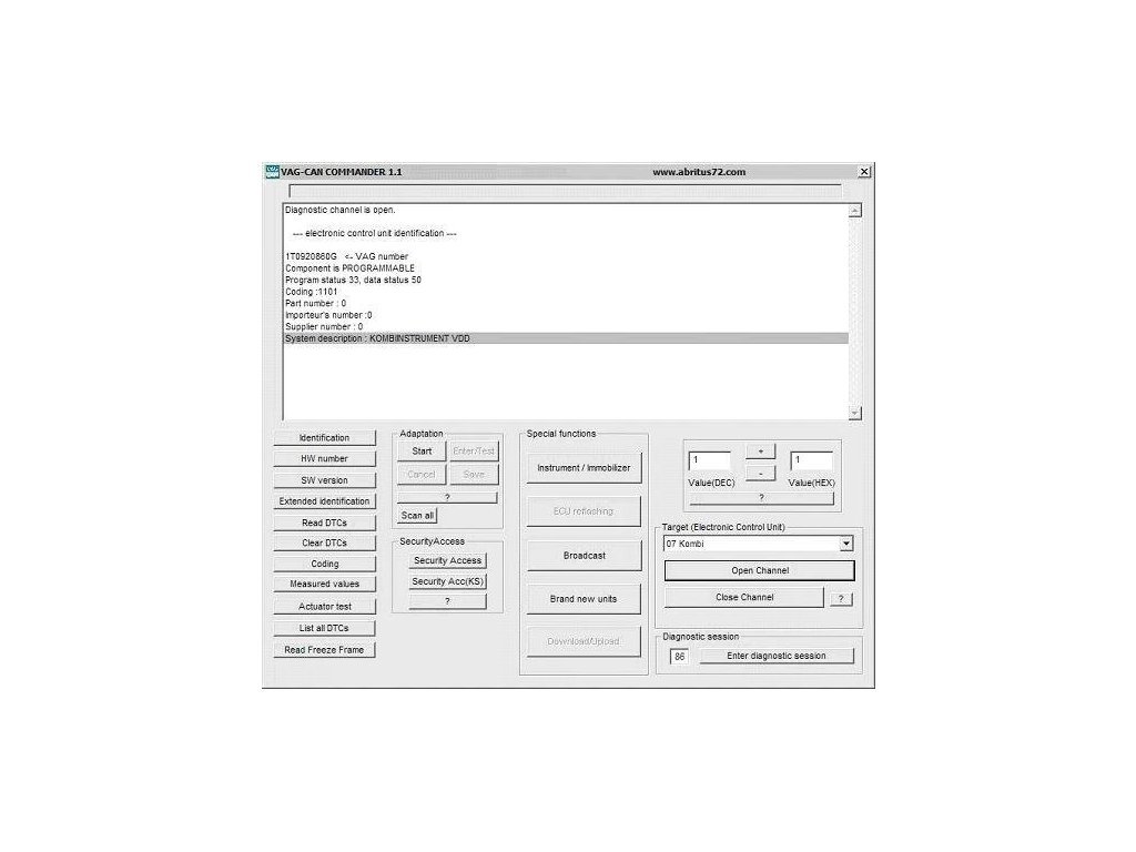 Je určena pro úpravu kilometrů, čtení PINů řídících jednotek, panelů přístrojů a řídících jednotek motorů, chiptuning, programování imobilizérů, přepis pamětí EEPROM jednotek motorů a přístrojových desek, smazání CRASH dat v jednotce AIRBAGů, aktivaci TV v jednotkách MMi a mnoho dalšího.