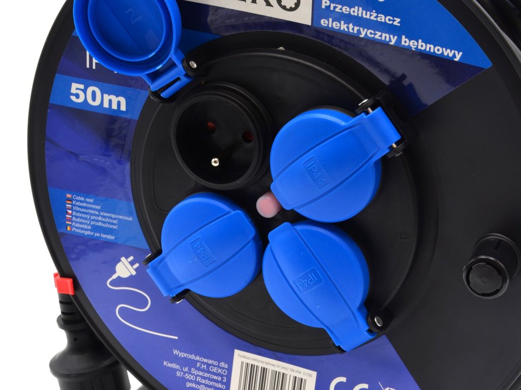 | Napájecí napětí | Délka (m) | Průměr kabelu | Jmenovitý proud | Stupeň krytí | Max. výkon při rozvinutí (W) | Max. výkon při navinutí (W) | Počet zásuvek |