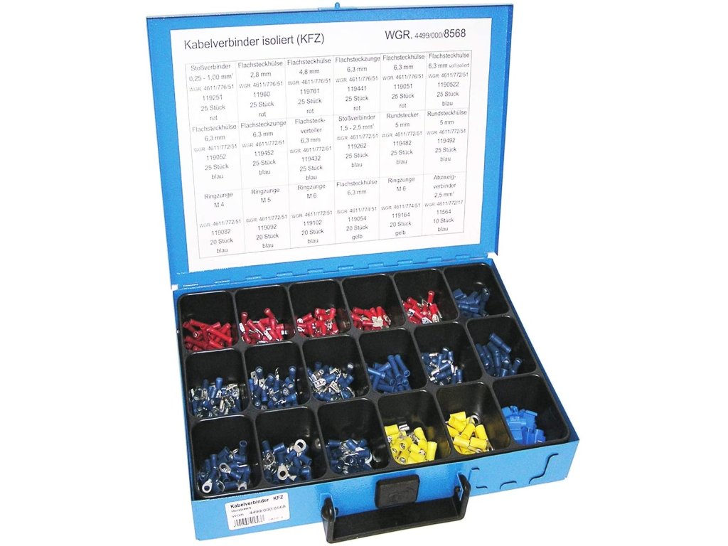 Obsahuje lisovací spojky, ploché a kulaté zástrčky, kabelová oka a zacvakávací konektory (tzv. rychlokonektory) pro elektroinstalace v automobilech, motocyklech, strojích apod.