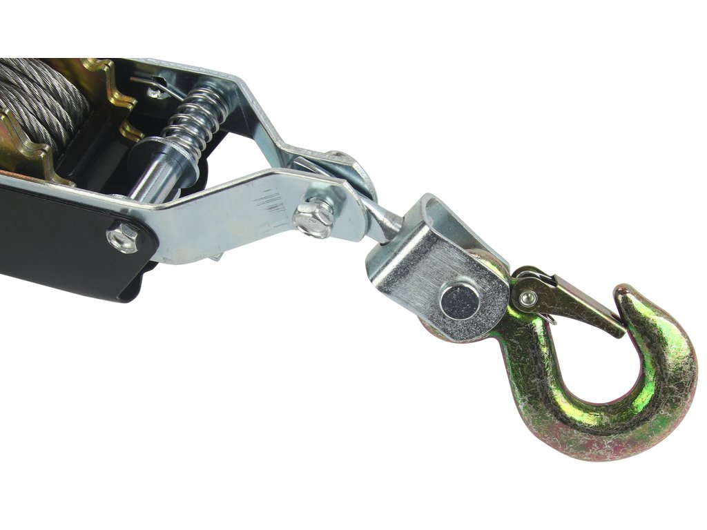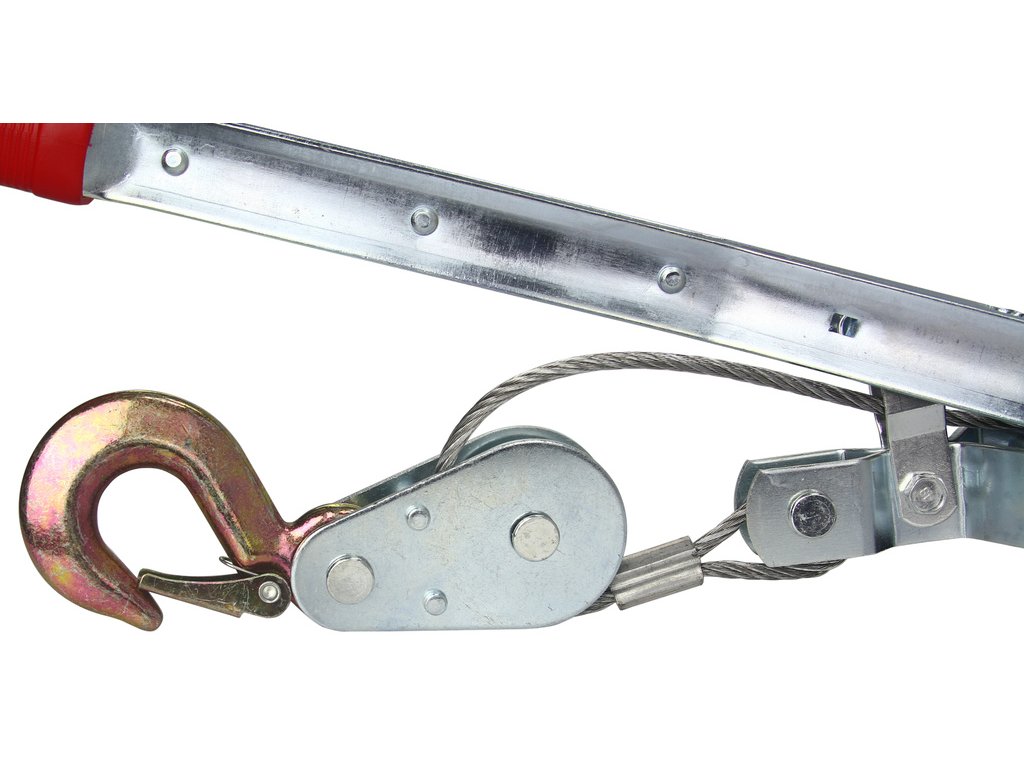 Ruční kladkostroj vyprošťovací dvouzubý, maximální zatížení 2 t, lano 1,8 m, tažná síla 7,84 kN.